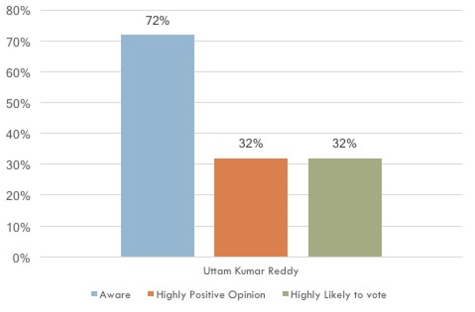 When the TPCC President and current MLA of Huzurnagar, MR.Uttam Kumar Reddy is projected as the candidate, Congress vote share significantly jumps from 27% to 32%. A deeper analysis on the voting preferences reveals even more interesting insights. The 48% TRS support is not sure shot figure to achieve as it included leaning congress voters about 6.3% and another 3% of the voters who were congress voters before but are predominantly undecided and are leaning TRS as a lack of a good candidate from Congress. When these TRS leaning otherwise Congress voters are presented with Uttam Kumar Reddy as congress candidate, about 8% of these have shown favorability towards Congress. Assuming Uttam Kumar Reddy banks all these votes, it will put Congress at a solid performance of 40% while TRS coming down to 42%. This dramatically changes by poll scenario as this will push the survey result into a statistical tie.