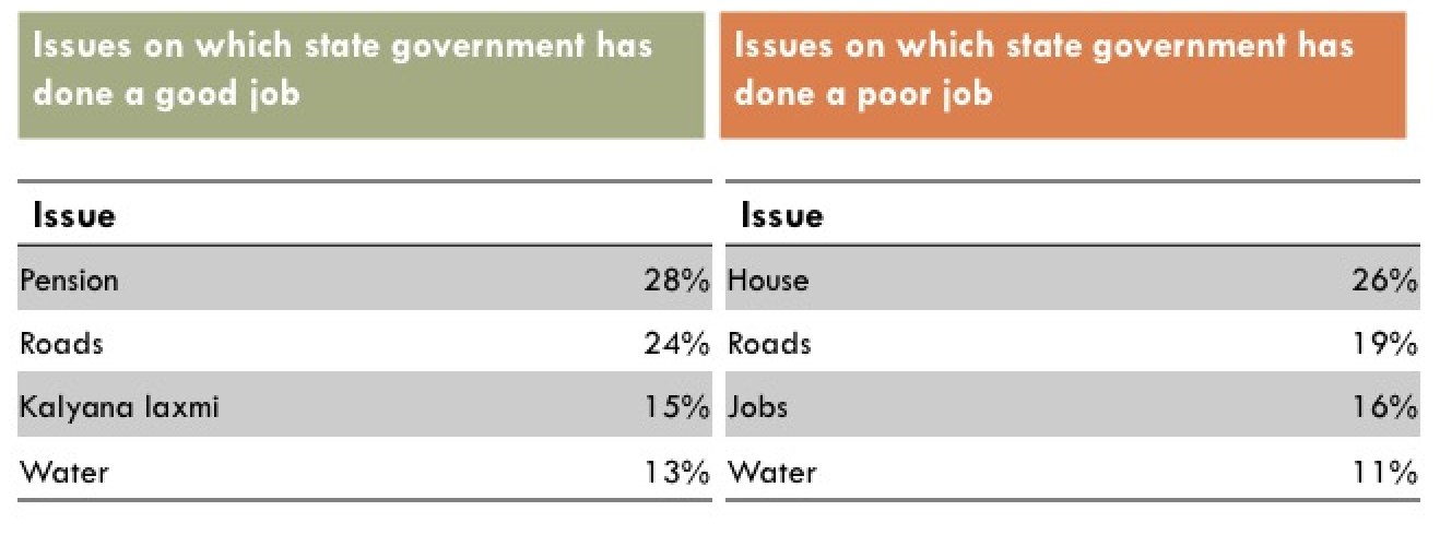 In spite of the huge success of TRS flagship policies like Aasara Pensions (28%), Roads (24%) and Kalyana Lakshmi (15%), a strong dissatisfaction comes from the performance of Double Bedroom flats (26%), and Jobs (16%). The other interesting fact is – those who positively see Mission Bhagheeradha providing drinking water (13%) is almost equal to those who see it otherwise(11%).