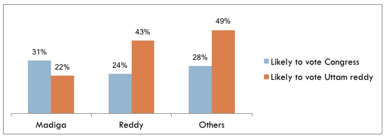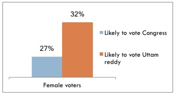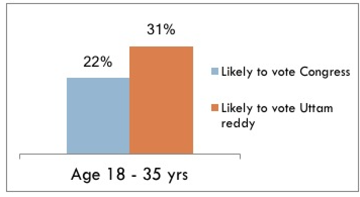 Although Congress is seemed as more close to the SC’s than TRS, Congress is not able to cash in the dissatisfaction in SCs that stemmed from incomplete implementation of “3-Acre land to SC’s” and only mere 22% SC’s are supporting Congress. Further, Congress is seen as more favorable on employment creation and about 14% of the electorate thinks jobs a big issue in the state, but the youngsters of Nalgonda are only partially supporting(31%) Congress. The most popular policy- Aasara pension scheme of KCR- is eating away Congress women’s support. Only 32% of the woman have showed preference towards Congress. Therefore, for congress it is even more tougher to win Nalgonda by poll.